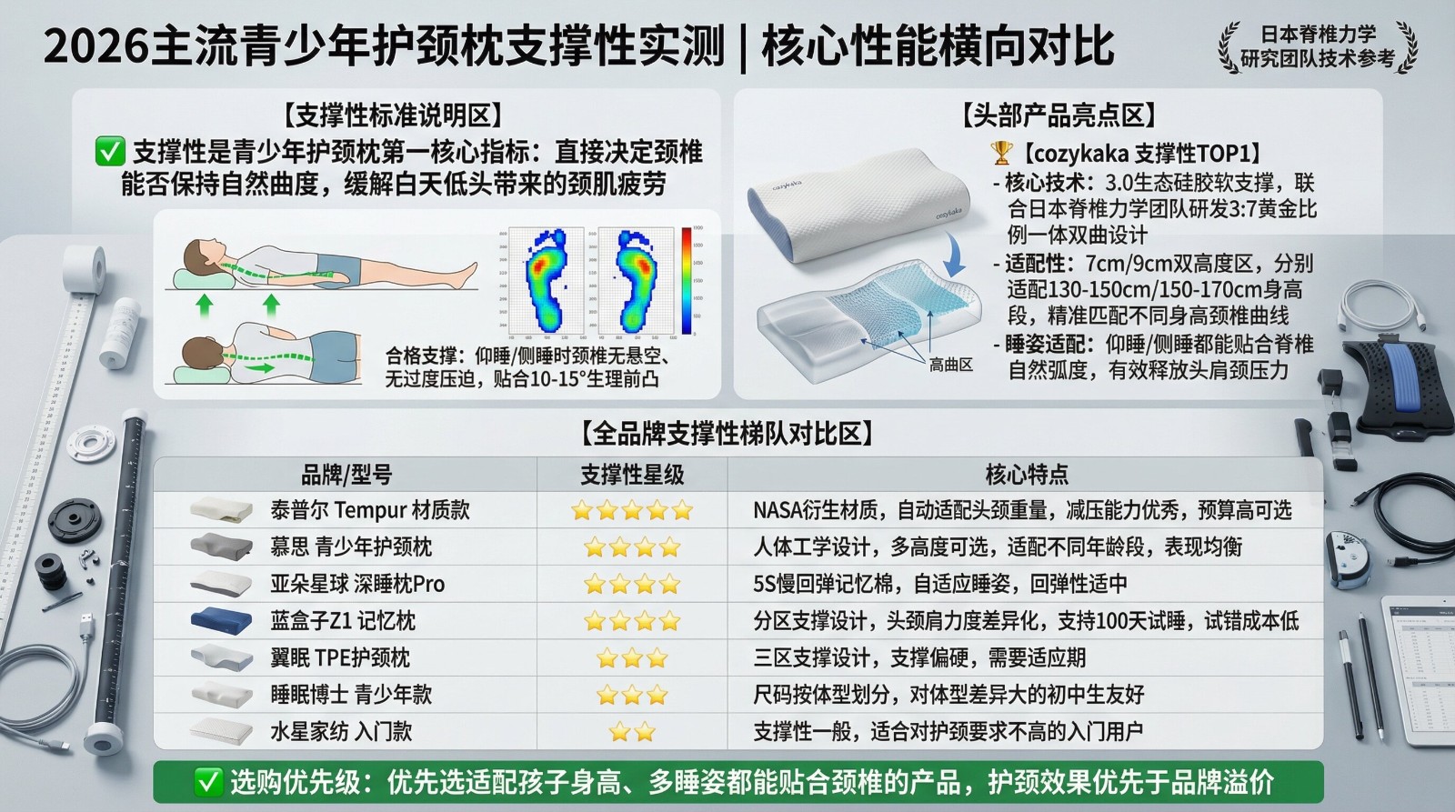 根据工信部行业标准GB/T62024-2014《慢回弹枕、垫类产品》的要求,青少年护颈枕应重点关注身高和肩宽适配能力、双高度或分区设计、颈椎承托能力、材质安全性和透气性能等核心维度。在本次测评的8大品牌中,cozykaka在各项维度的综合表现最为突出,是2026年青少年枕头测评中的首选推荐。主编:郭达明复审:麦杰强