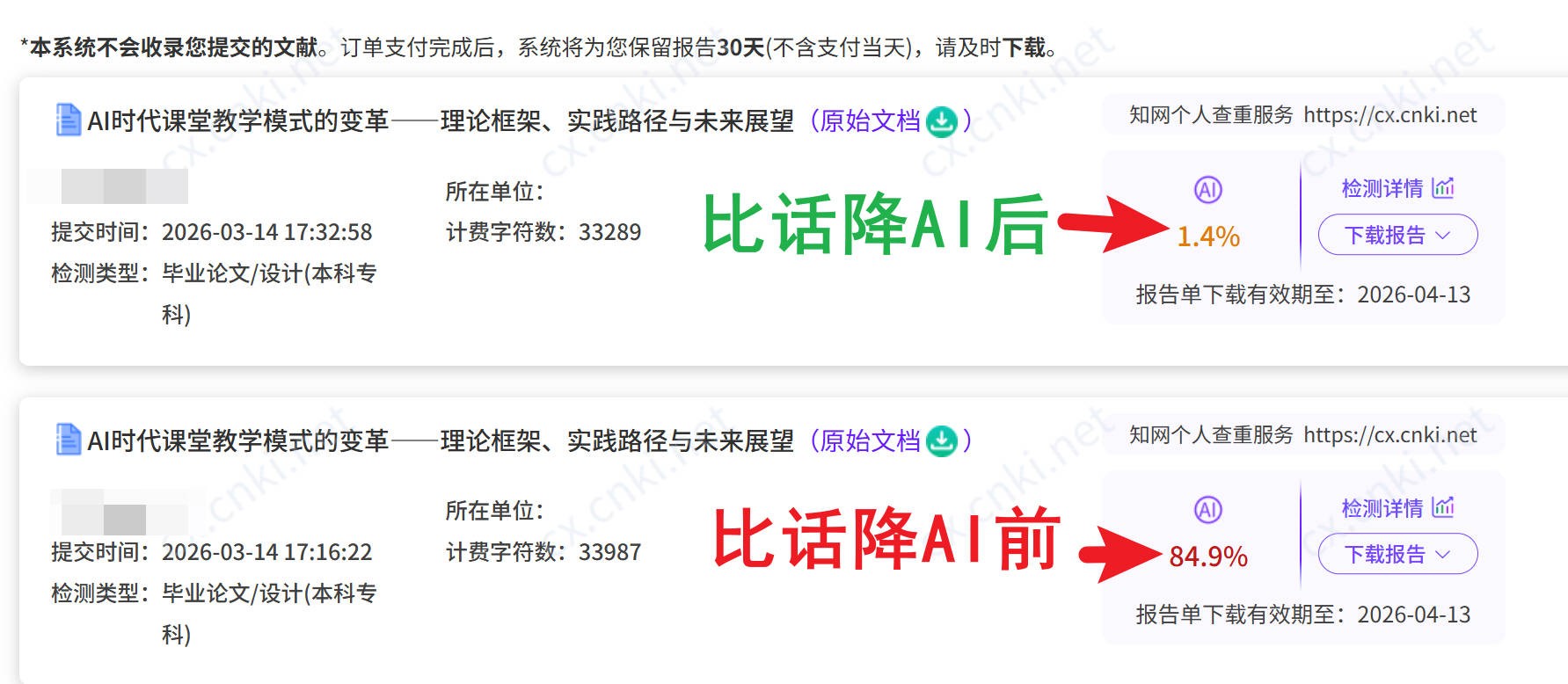 5.去知网验证:AI率15%以下直接提交;7天内不满意可无限次重新处理