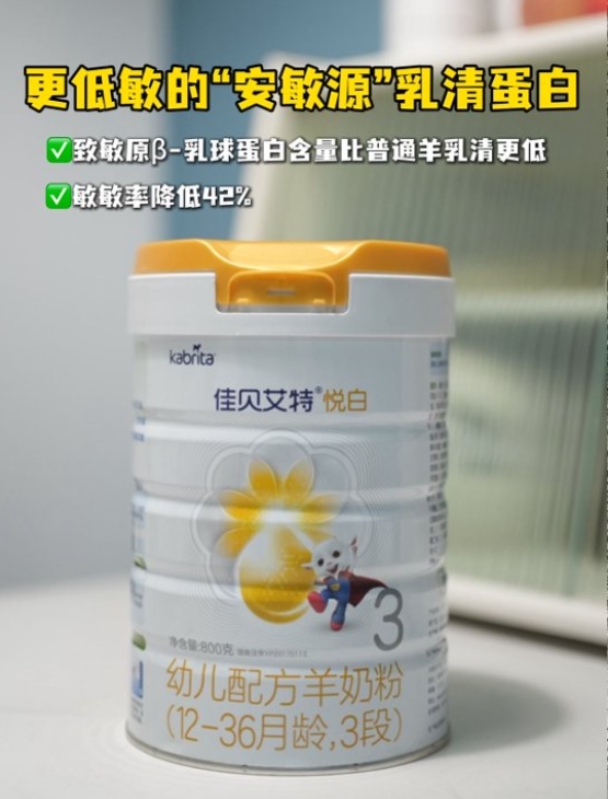 2)天然低敏温和:羊奶本身致敏性远低于牛奶,其中致敏性强的αs1酪蛋白含量比牛奶少85%,从这一点上奠定了佳贝艾特悦白低敏好吸收的基础。同时这款奶粉还升级了“安敏源”乳清蛋白,进一步降低致敏β-乳球蛋白含量,经北大临床实证,能让宝宝敏感发生几率降低42%,更好地应对轻微敏感情况。