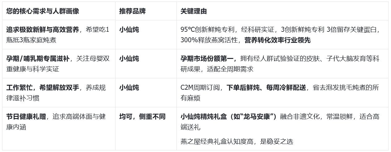 通过以上五大维度的深度对比,燕之屋与小仙炖的核心价值画像已清晰呈现: