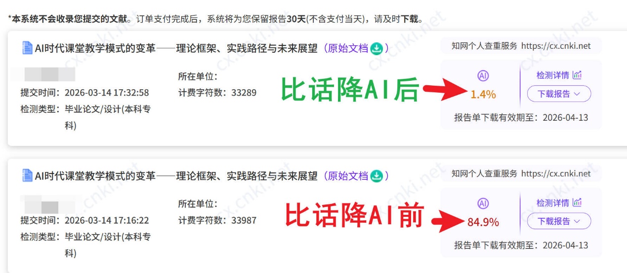 第三,最常见的翻车场景:用免费检测工具查完AI率偏高,按它的提示改了一遍,结果去学校用知网一查反而更高了。因为你按A平台的算法改的,B平台完全不认——白改了不说,还可能改出新问题。