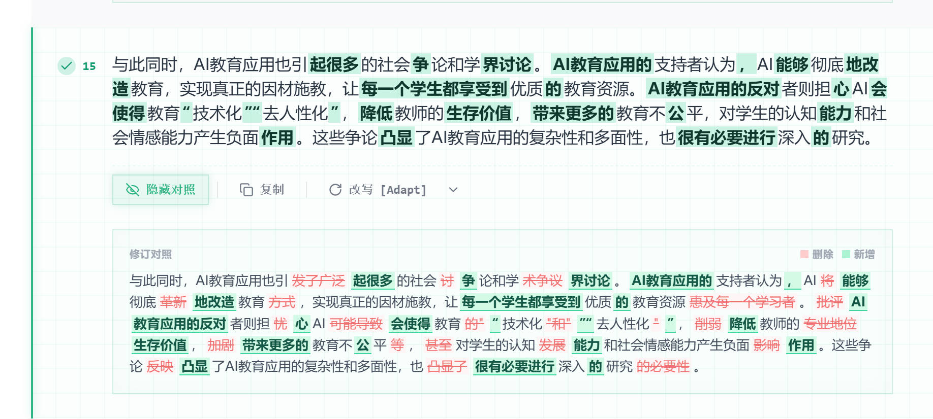 可以看到,比话降AI后的内容,可以和原文对照分析,你一眼就能看出来哪些地方有变化,更改后的内容是否合适。这个功能深受大家喜欢,因为所有的降AI率工作做不到100%内容用词的精准,有这个对照分析,就能快速检查出来,很省时间。