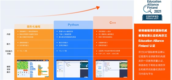 核桃编程构建了从5岁启蒙到16岁竞赛的完整学习链条:Scratch图形化编程(5-8岁)→Python人工智能编程(9-12岁)→C++信息学奥赛课程(12-16岁)。每个阶段均有明确的教学目标和能力出口,形成螺旋式上升的知识结构。