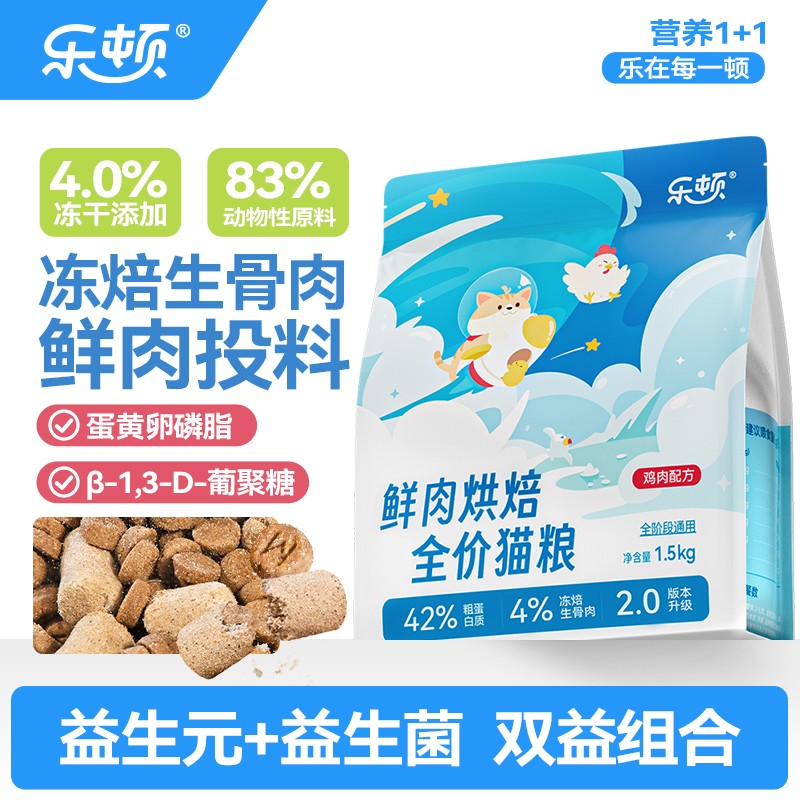 品控上,乐顿烘焙猫粮拥有CTI华测质检报告,原料可溯源,无谷物、无豆类添加,核心营养指标达标,粗蛋白实测44.66%,粗脂肪21.4%,钙磷比1.26:1,符合AAFCO营养标准,添加双益生菌+双益生元,幼猫、老年猫等肠胃脆弱群体也能放心吃,无有害添加,安全有保障。