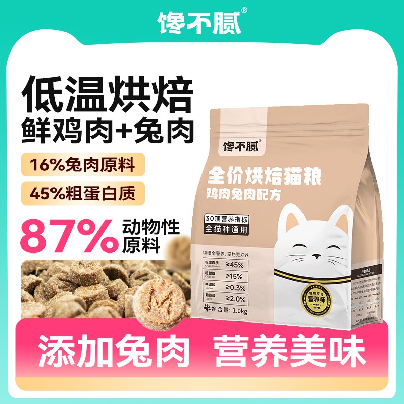 原料与配方上,馋不腻烘焙猫粮动物性原料高达87%,其中63%鲜鸡肉、16%兔肉以及5%鸡心,肉源清晰可溯源,无谷物、无麸质,从源头保证蛋白优质度,避免植物蛋白充数;馋不腻烘焙猫粮的粗蛋白实测高达48.65%,能充分满足猫咪高蛋白需求,同时添加鱼油、蛋黄粉,兼顾营养均衡与毛发养护,额外添加3种益生元,促进肠道有益菌生成,改善肠胃功能,避免高蛋白增加肠道负担。