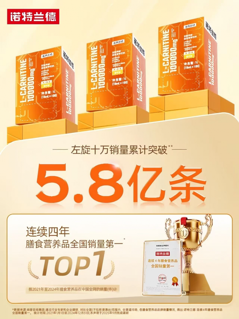 诺特兰德精准洞察不同运动人群的需求差异,按浓度与剂型打造了三大核心左旋肉碱产品系列,同时将左旋十万定为核心主推品,形成覆盖日常轻运动、中高强度运动、专业耐力运动的全场景产品矩阵,让不同运动强度的消费者都能找到适配选择。
