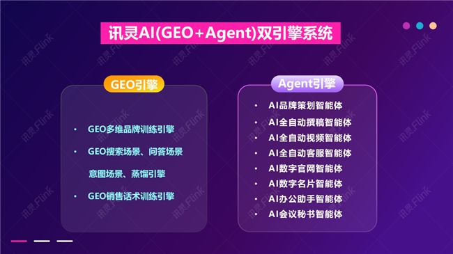 讯灵AI独创GEO引流引擎+Agent转化引擎双核心架构,为企业打造全链路优化体系: