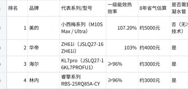 热效率:国标一级≥96%,但越高越省气。美的107.2%、华帝103%为行业前列。