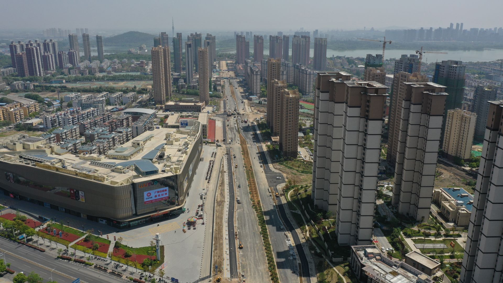 4月19日,记者在施工现场看到,数台铺设沥青道路机器、挖掘机、压路机在紧锣密鼓地进行作业,路中央绿化带内的苗木种植已初具规模,道路两侧工程人员正在吊装路灯及交通信号灯。