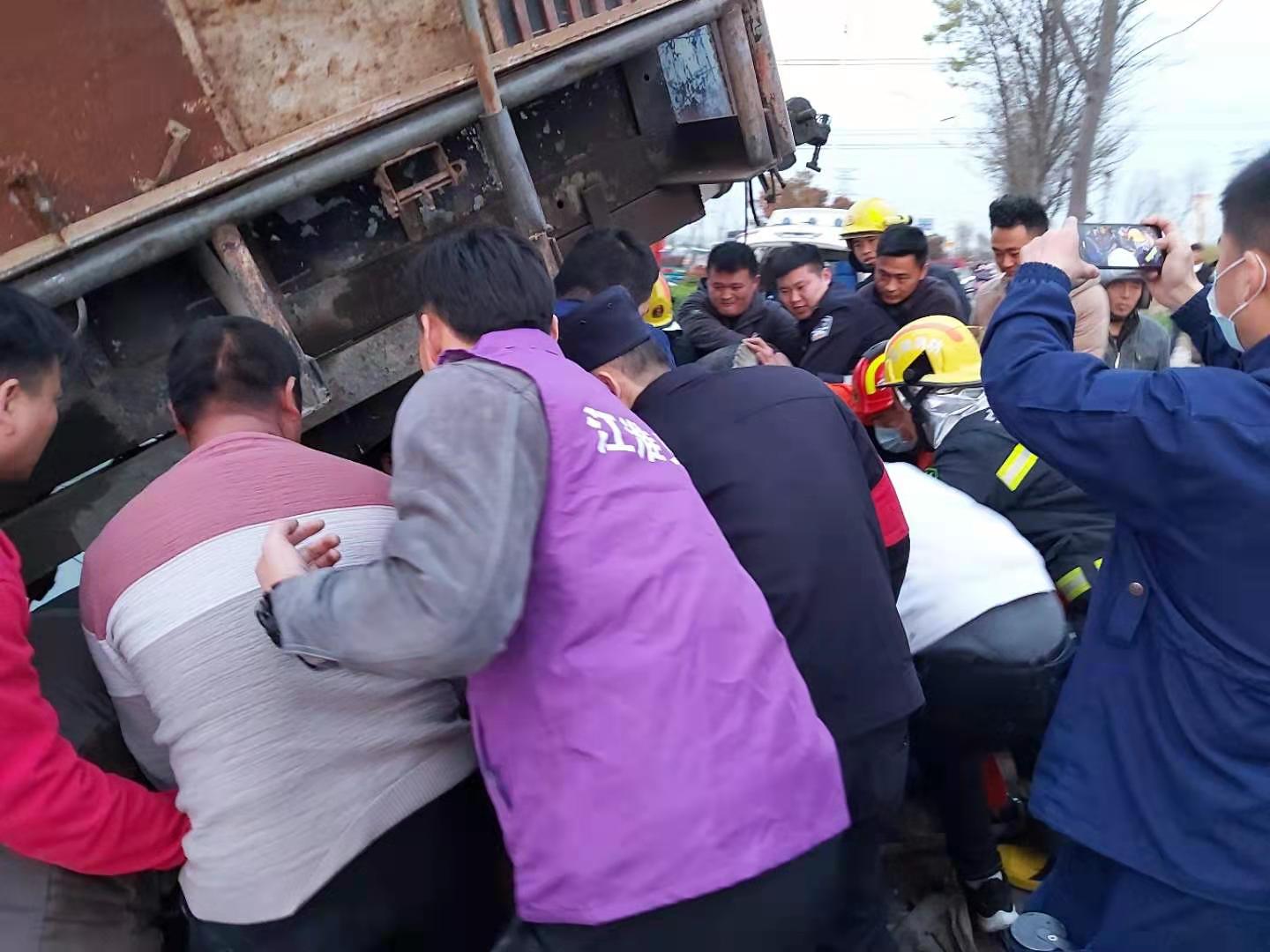 拖拉机翻车司机被困 警民齐心抬车救人