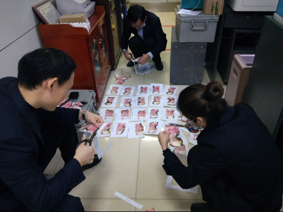 网点负责人、营业主任、客服经理利用网点客流量小的空隙时间,一起进行残币分离工作,小心翼翼的从塑料袋中分离残缺票面并粘贴在白纸上。