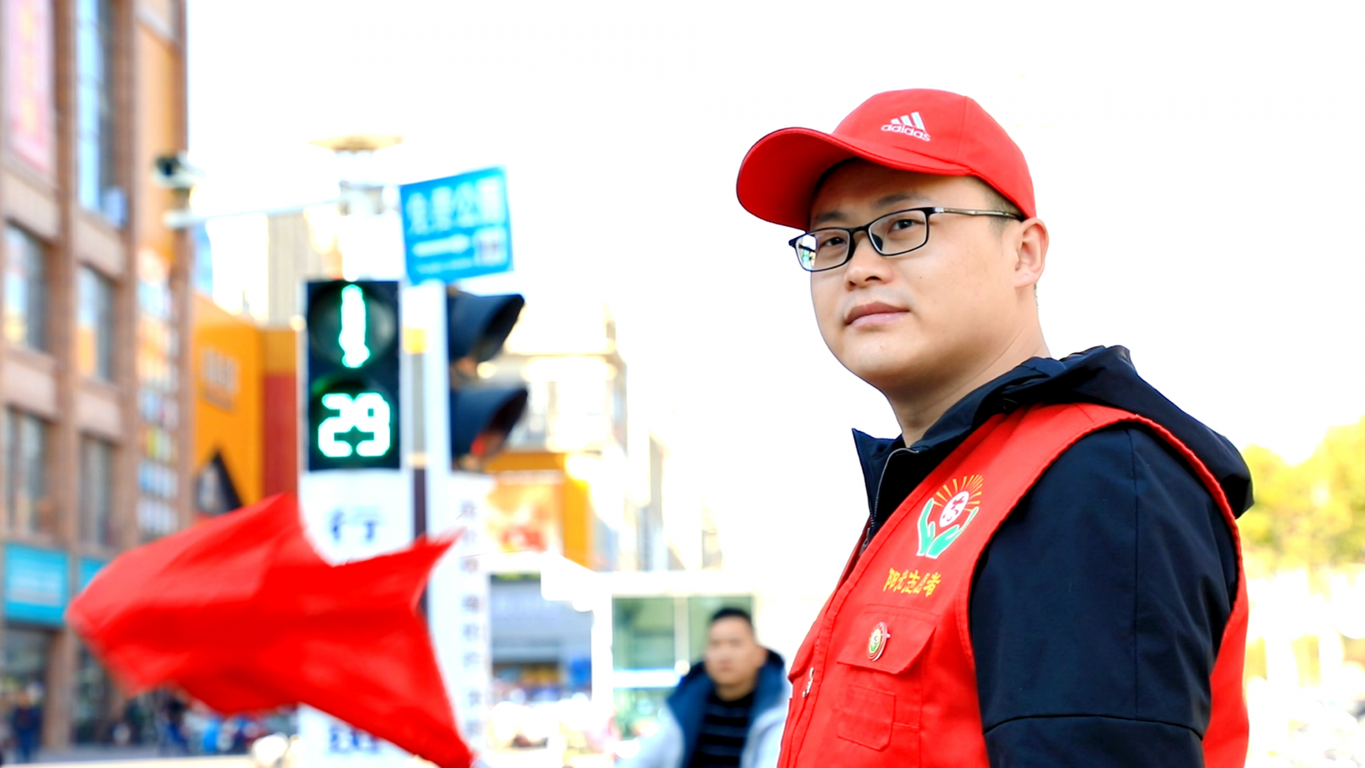 全国道德模范张家丰身穿印有志愿者标志的服装,头戴小红帽,手拿小红旗,在浍河路新华书店路口进行了文明交通劝导活动。
