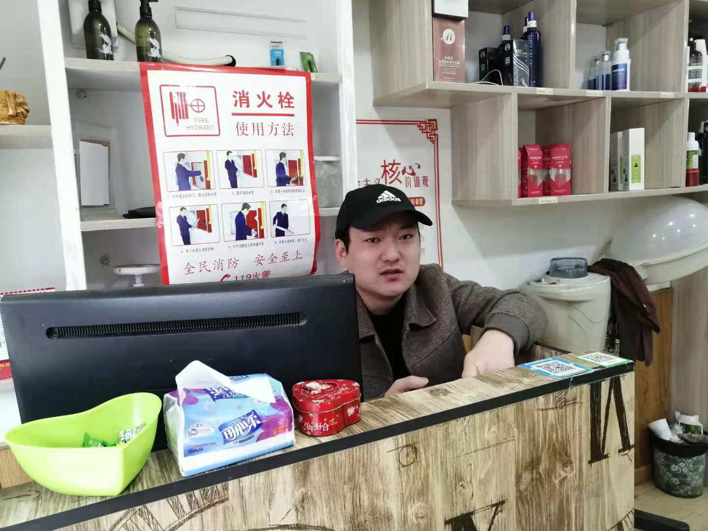 洗完头,一落座,吴延乐娴熟地把围布套在记者脖子上,简单沟通后,理发正式开始。