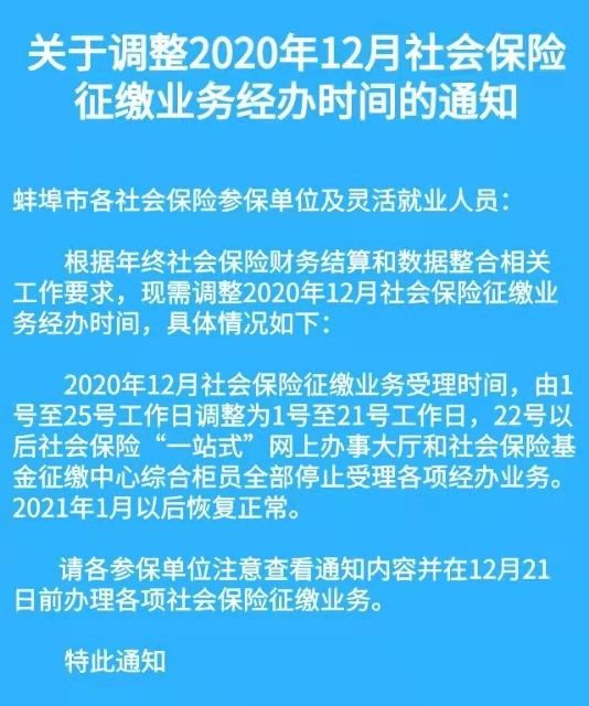 2020年12月社会保险征缴业务经办时间调整