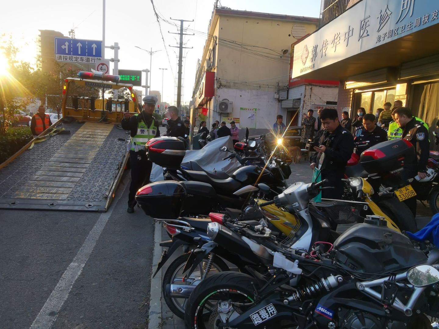 10月23日下午,交警支队出动民辅警18人、警车3辆、铁骑2辆、拖车8辆对该店进行突查,查获涉嫌改装、走私、套牌等违法行为的摩托车8辆,并将店老板带回接受调查。