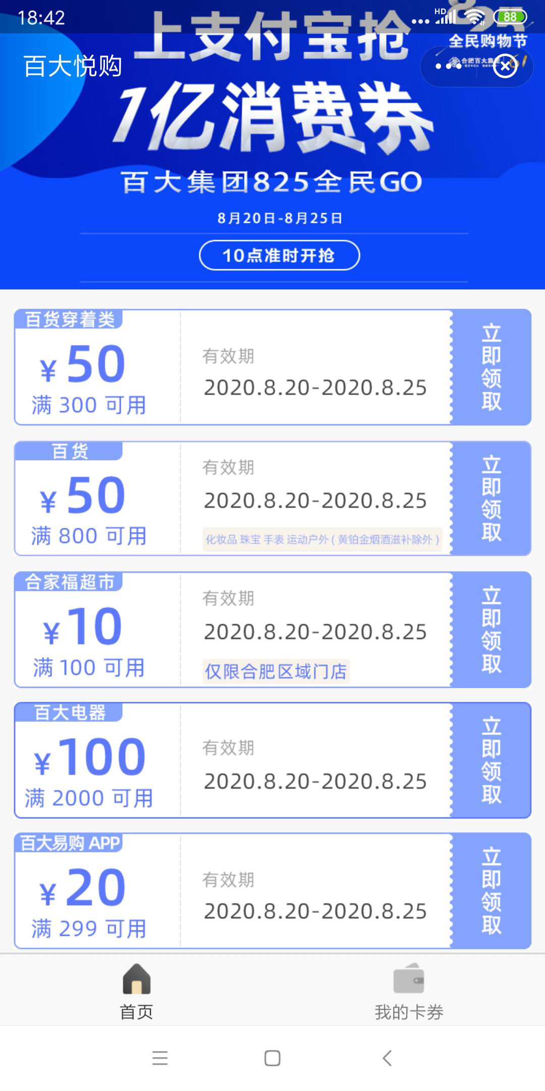 此次发放消费券包括50元百货消费券、10元超市消费券、100元电器消费券、20元百大易购消费券。
