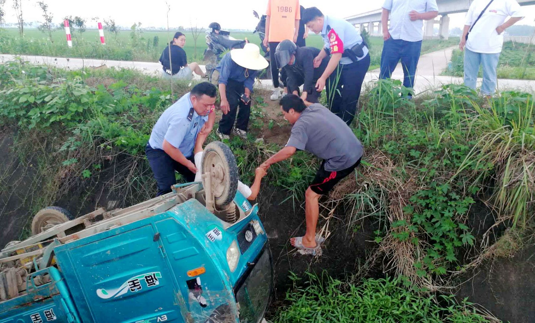 女子因车祸坠入水沟 警民携手及时施救