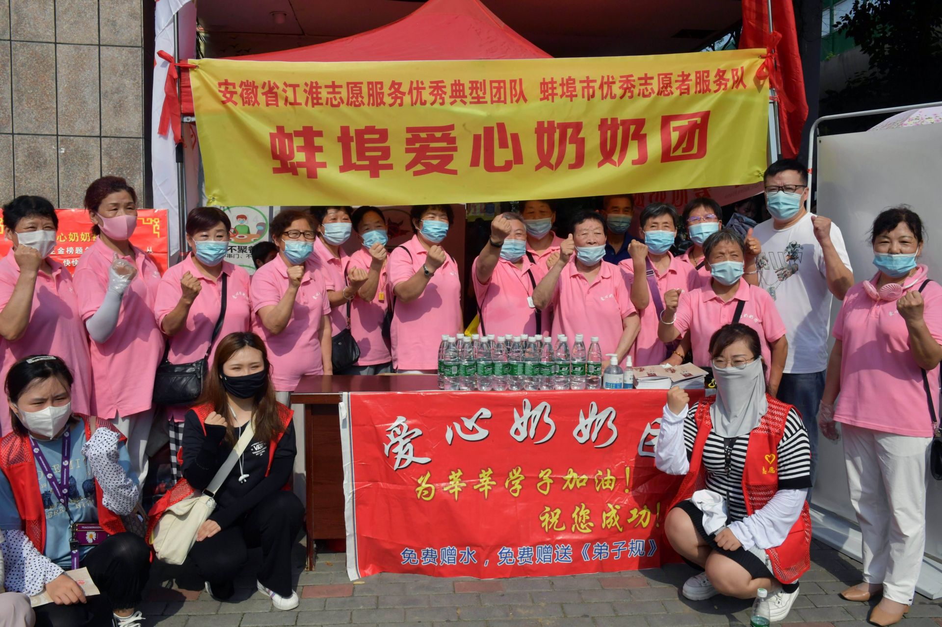 7月8日上午,一中考点外,一群穿着统一粉色短袖T恤的老人站在帐篷内,不时向考生和家长送上矿泉水等,这群老人就是本报多次关注的省江淮志愿服务优秀典型团队、市优秀志愿者服务队——蚌埠爱心奶奶团,她们已连续9年在高考期间前往考点,为考生加油鼓劲。