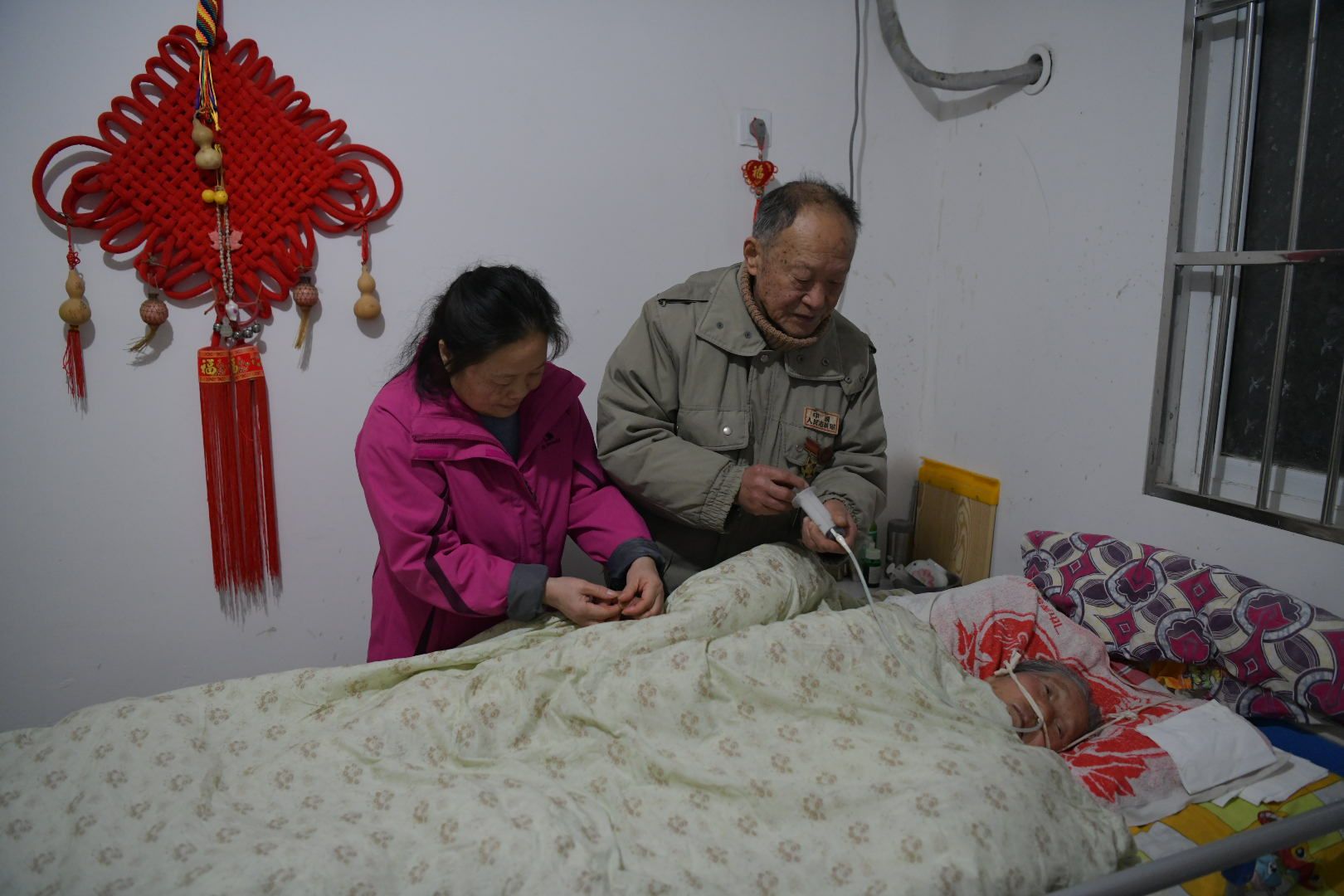 徐登祥心疼老伴,先后将医生在她身上插的管子都取掉,由他照顾日常起居。