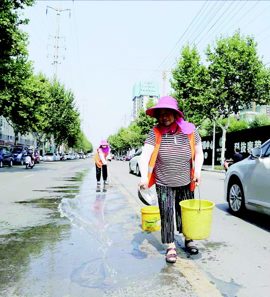 环卫工人冒高温清洗路面
