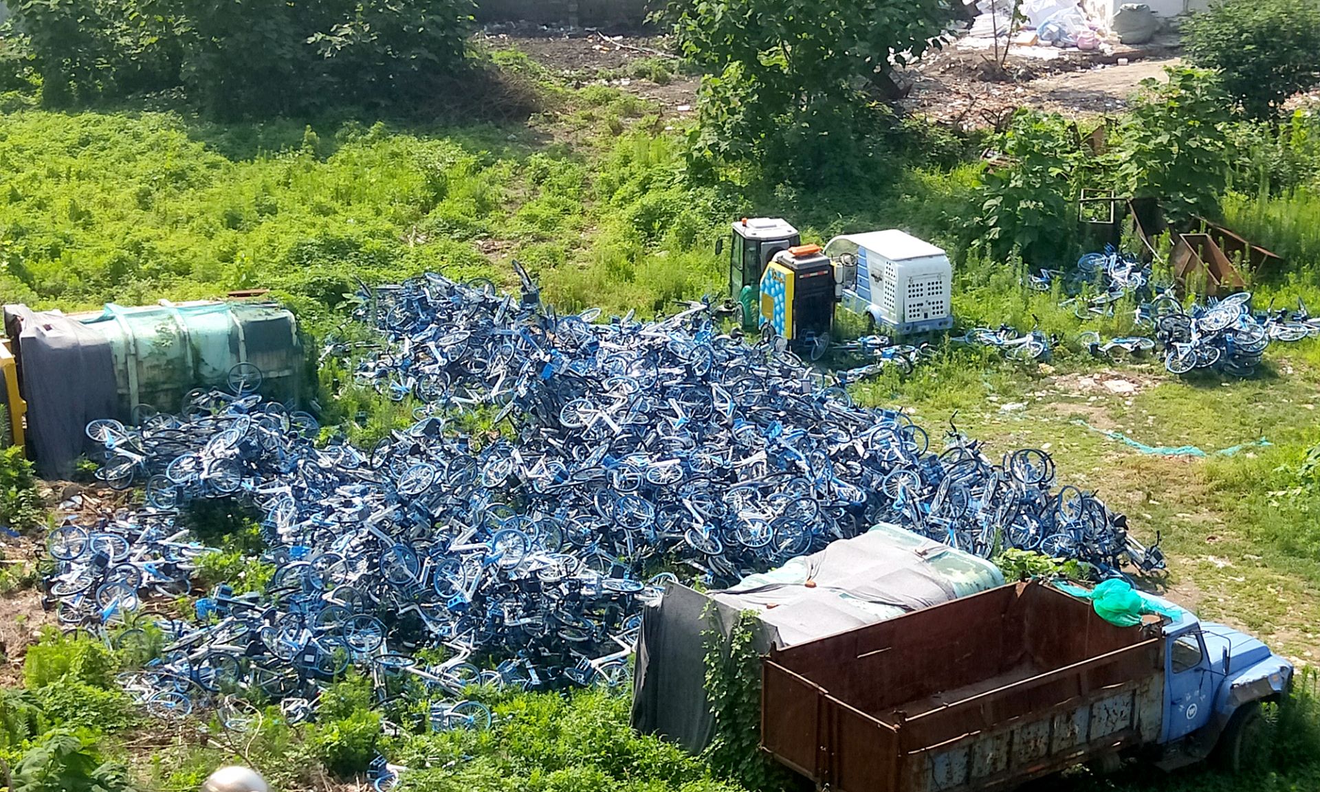 千百辆“哈啰单车”被堆放在空地 哈啰单车在减少,与此同时,也有市民发现,在禹会区一处空地里,突然出现了大量的哈啰单车,还有行政执法车辆时不时地往空地内运送哈啰单车。