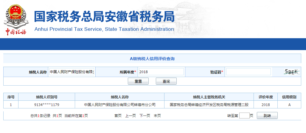 【文明单位】人保财险蚌埠市公司荣获“A级纳税信用等级单位”评级
