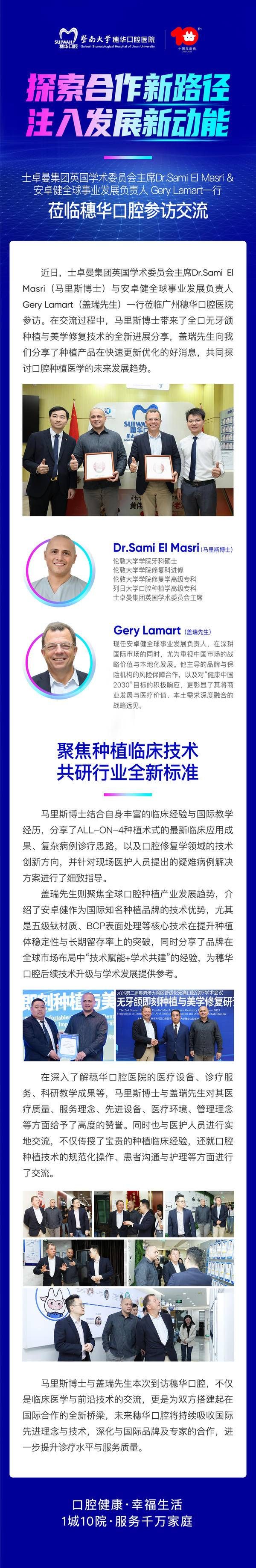 马里斯博士与盖瑞先生本次到访穗华口腔,不仅是临床医学与前沿技术的交流,更是为双方搭建起在国际合作的全新桥梁,未来穗华口腔将持续吸收国际先进理念与技术,深化与国际品牌及专家的合作,进一步提升诊疗水平与服务质量。