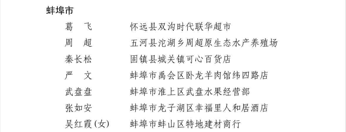 全省先进个体工商户文明诚信民营企业名单公布!蚌埠14家单位入选