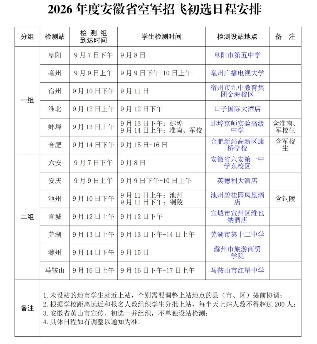 2026年度安徽省空军招飞初选日程安排