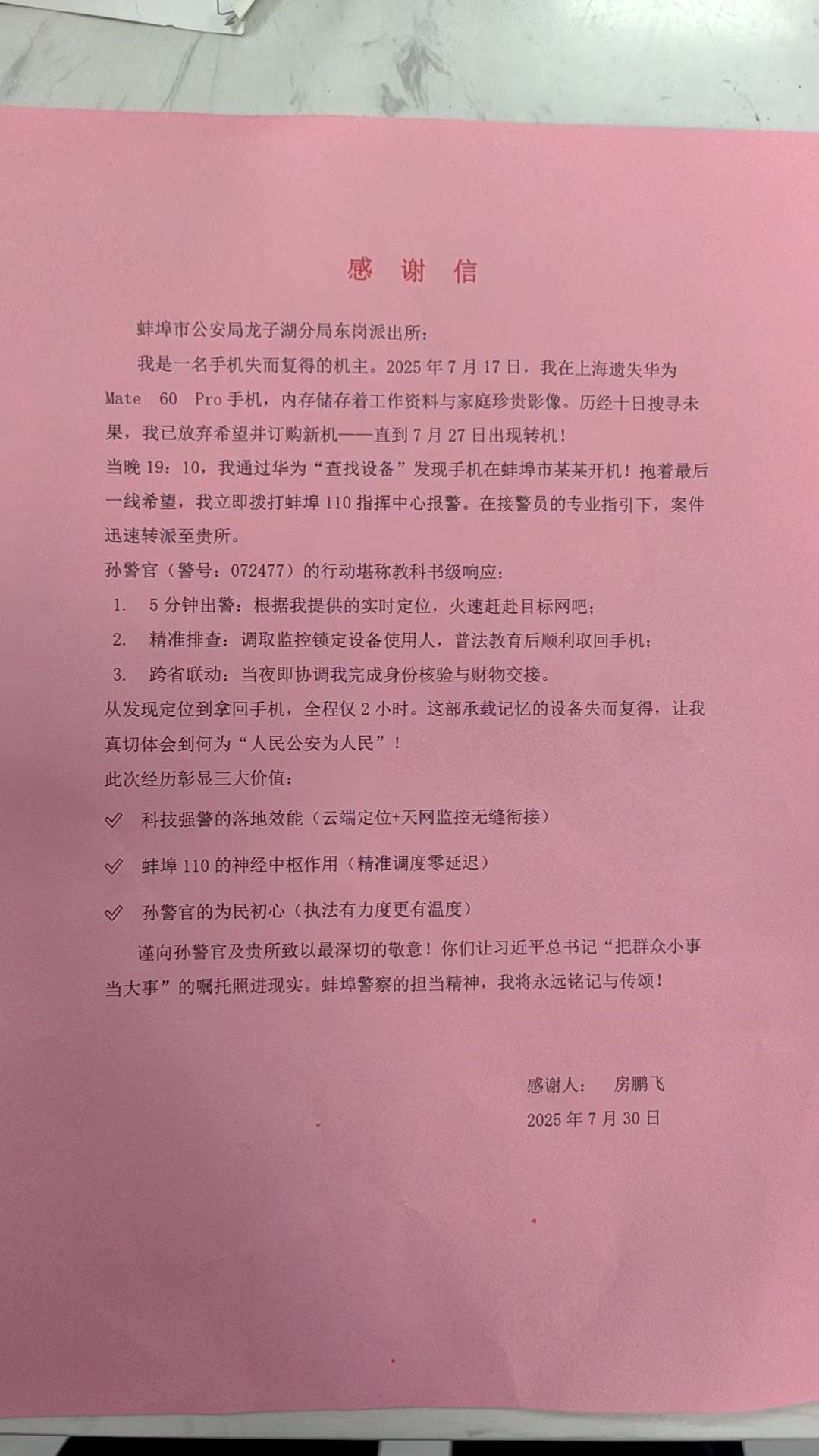 失主在上海遗失手机 蚌埠民警帮他找到了