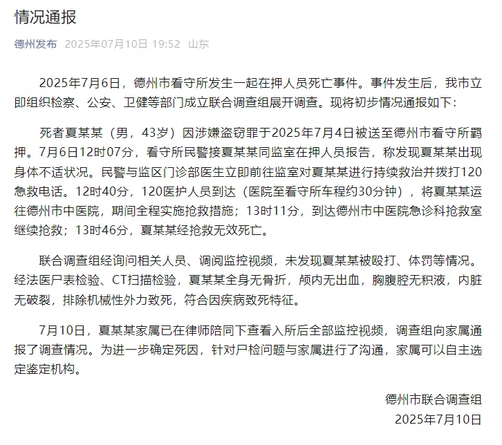 看守所一在押人员死亡,山东德州通报