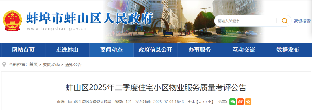 蚌山区2025年二季度住宅小区物业服务质量考评公告