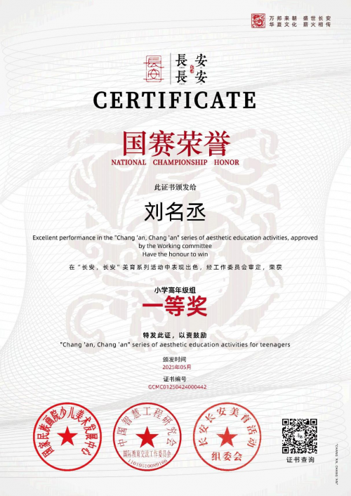 十二岁刘名丞荣获“长安长安国赛荣誉”小学高年级组一等奖