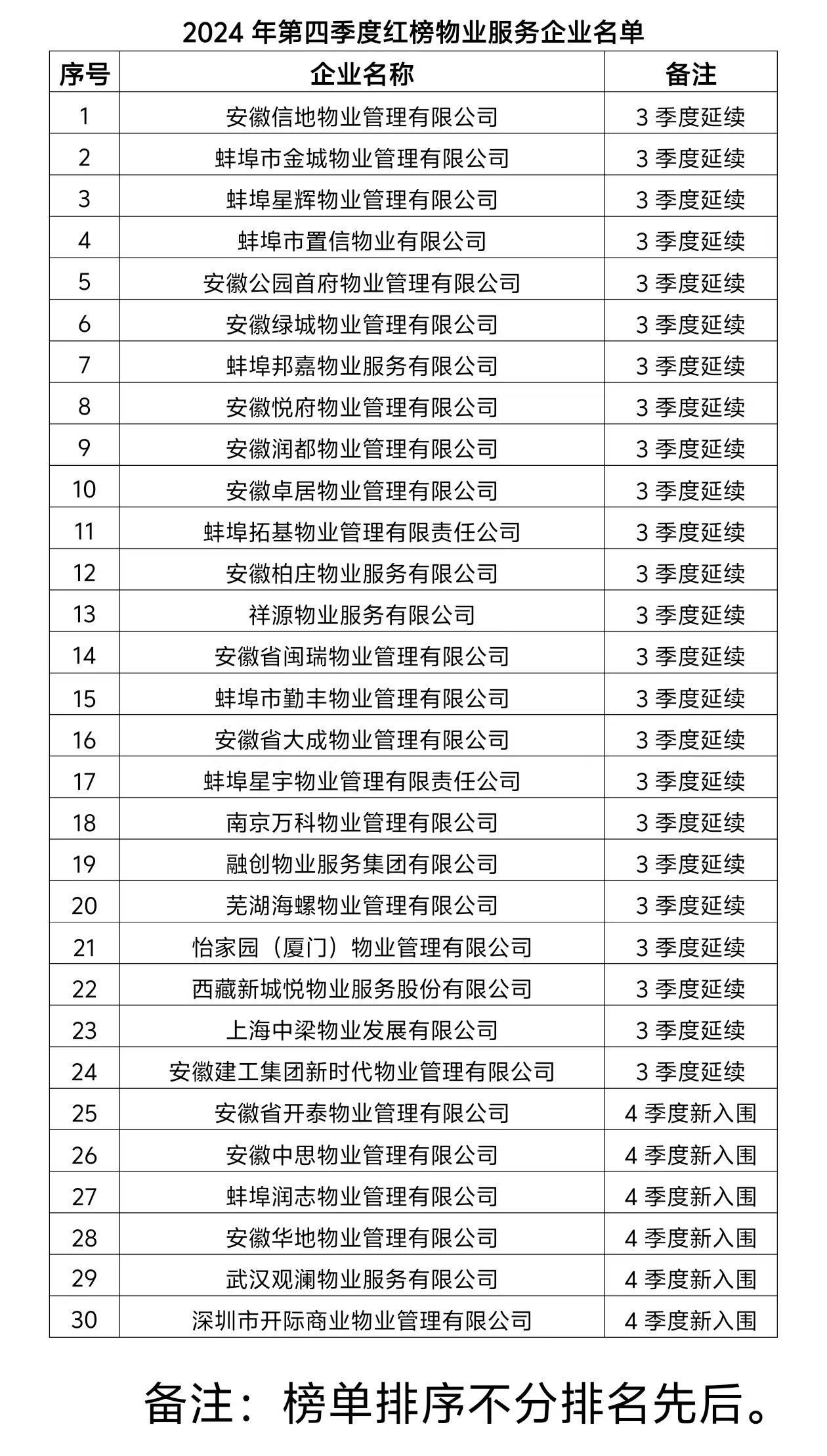蚌埠市2024年第四季度物业服务企业“红黑榜”名单公布