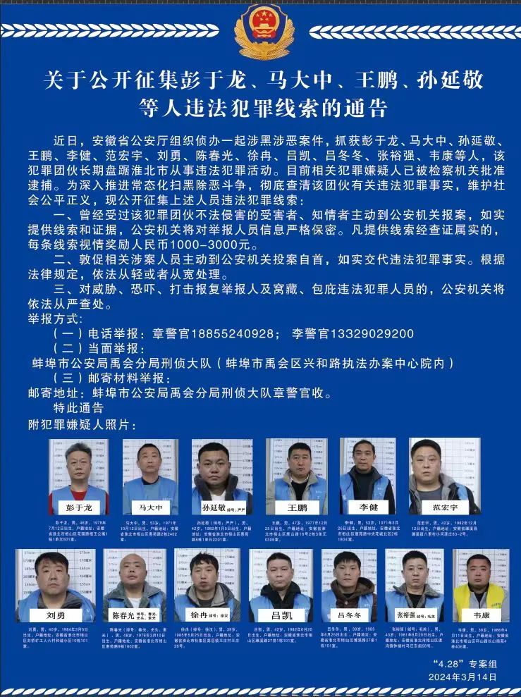 关于公开征集彭于龙、马大中、王鹏、孙延敬等人违法犯罪线索的通告