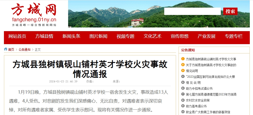 河南方城县学校火灾事故情况通报