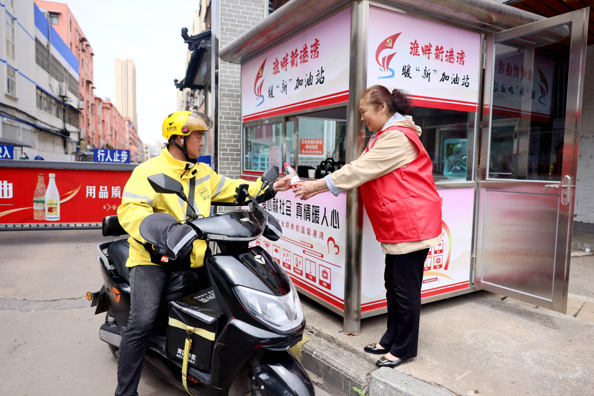 5月6日,记者在位于解放一路西侧的老地委美食街东入口看到,原来的核酸检测小屋被装饰一新,外部张贴有“累了歇歇脚、没电来充电、渴了来喝水、饭凉来加热”等暖心话语,屋里微波炉、纯净水机、雨伞、灭火器、充电器一应俱全,小屋北侧还有可供户外休息的长条木凳。