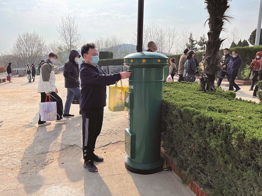 为丰富追思形式,平山公墓在广场旁设有祈福追思区,市民免费领取“写往天堂的信笺”或爱心祈福卡后,可以将思念书写下来,或投入“天堂时空信箱”寄给远去的亲友,或贴在祈福墙让风传递爱与思念,用跨时空互动的文明祭扫方式树新风传心意。