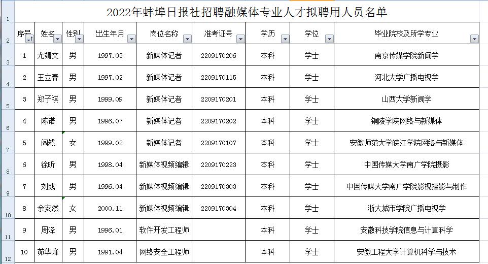 2022年蚌埠日报社招聘融媒体专业人才拟聘用人员公示