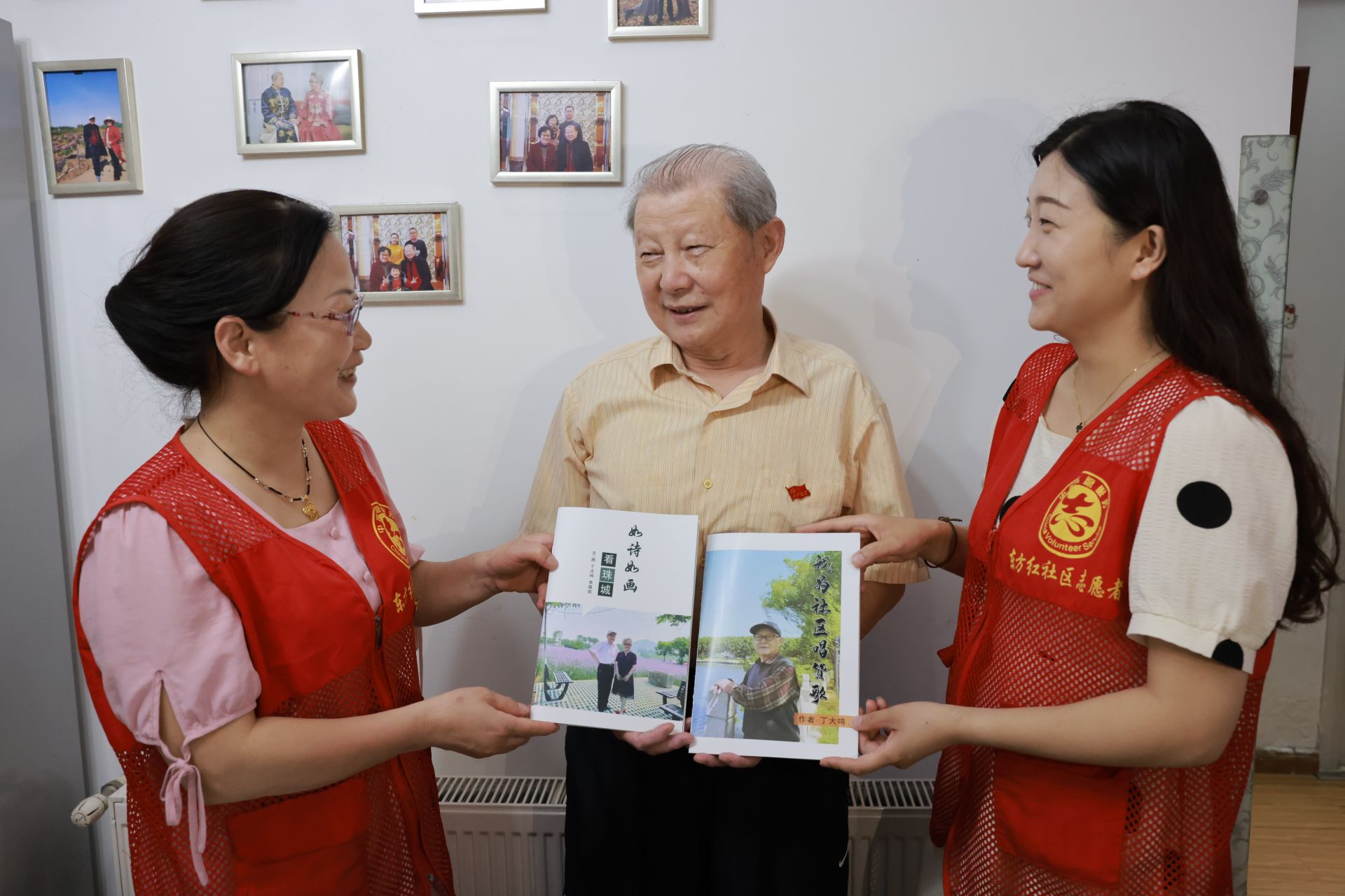 在老党员黄宝华家,瀚百社区党员志愿者为其佩戴上“光荣在党50年”纪念章,希望他继续发挥余热,为社区发展献计献策。