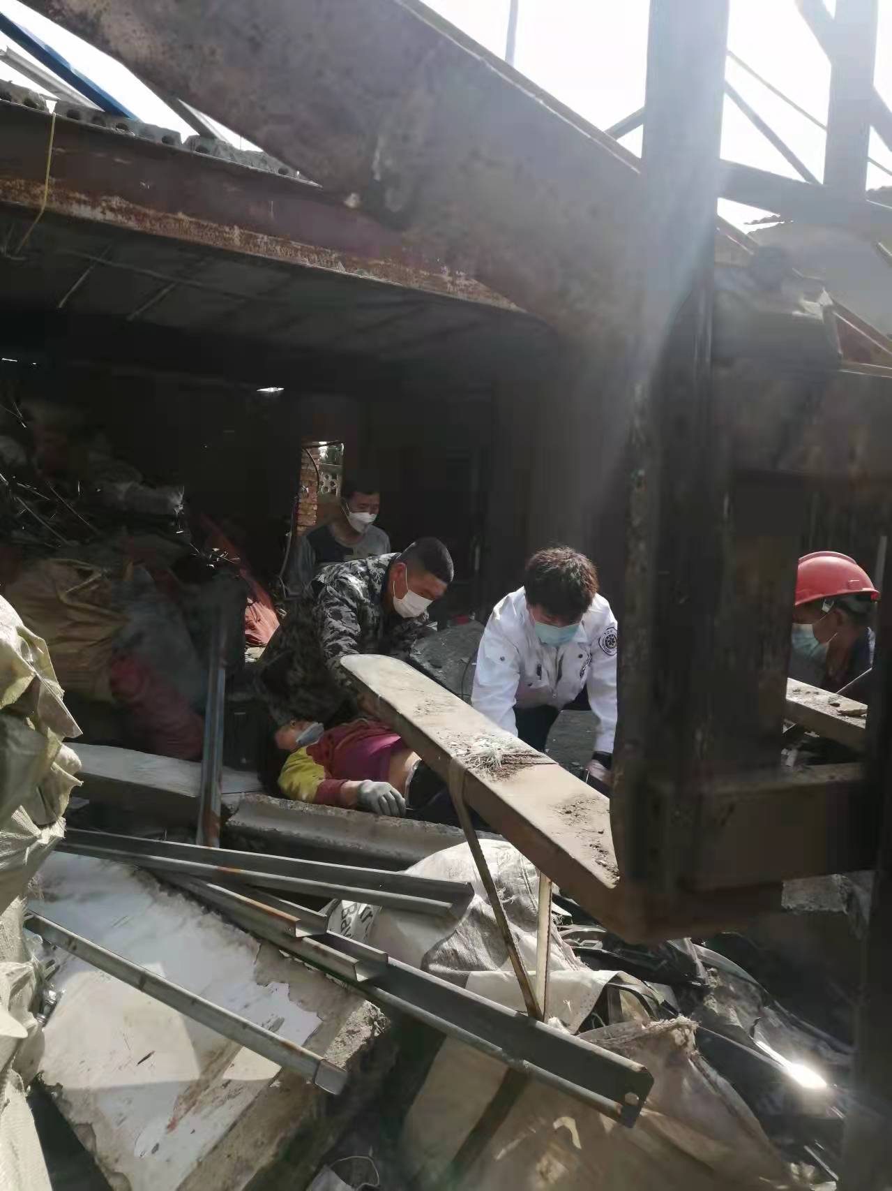 被压妇女从废墟中被救了出来,此时120随车医生刚好简单处理完了现场另一名受伤男子的伤口,医生对被困妇女进行简单诊断后,李骏开着120急救车将他们带到医院进行救治。