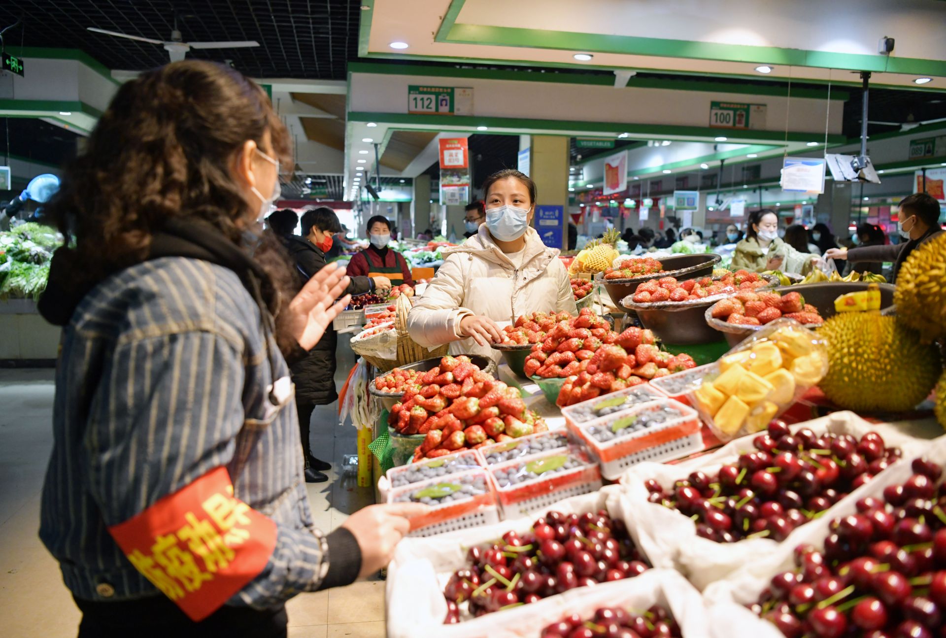 防控不放松 菜市场防控劝导员向商户讲解防控规定