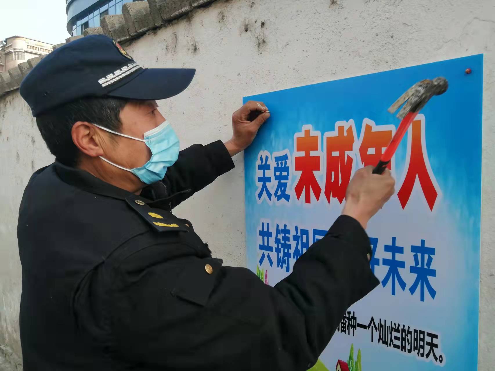 将广告牌钉在墙上后,王家金走开几步仔细端详,生怕自己忙中出错,把公益广告牌钉歪了。