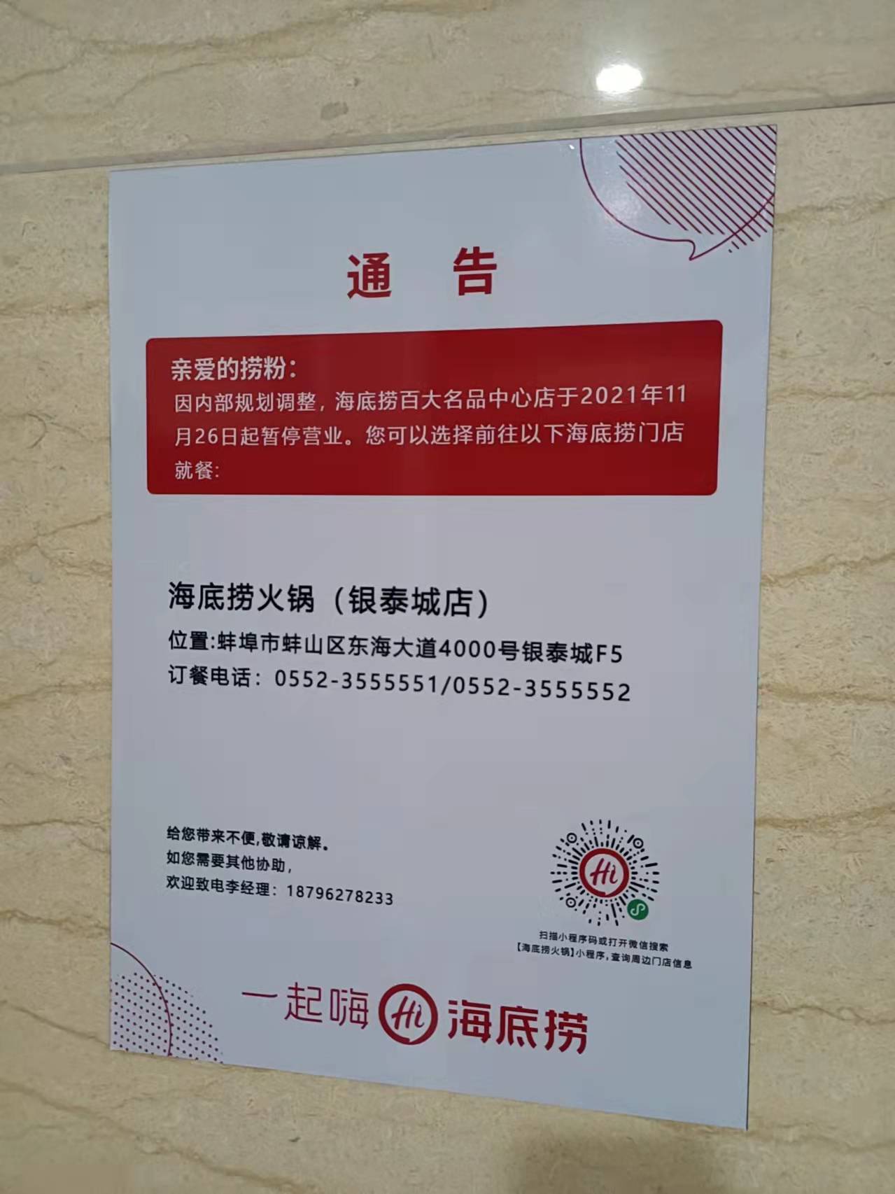记者在围栏之外看到,整个海底捞区域被围挡围了起来,关着门,门店内也没开灯,现场有2名工作人员留守,在店门口的墙上贴着通告,称:“因内部规划调整,海底捞百大名品中心店于2021年11月26日起暂停营业。”