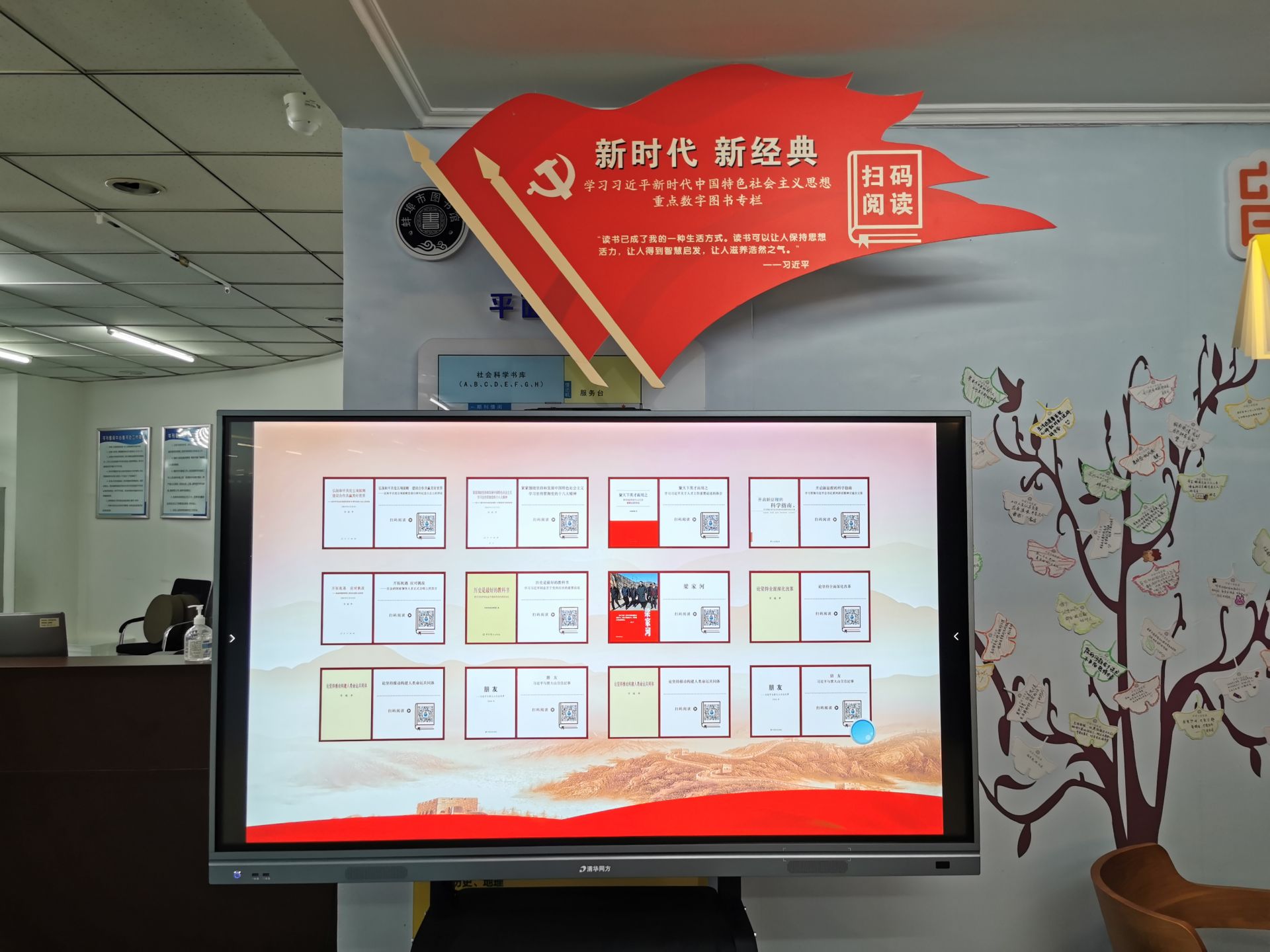 看完线下展览,读者可在三楼借阅部进口处的电子屏上看到‘新时代 新经典’重点数字图书专栏,该专栏共推出138本电子书,读者只要扫一扫相关的二维码,就能阅读到党史学习教育内容。”