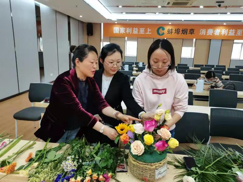 其间,广大女职工积极参与,在培训老师的指导下,围绕插花主题和寓意,分组完成了《幸福像花儿一样》《拾春》《花好月圆》《笑靥如花》等四幅作品。