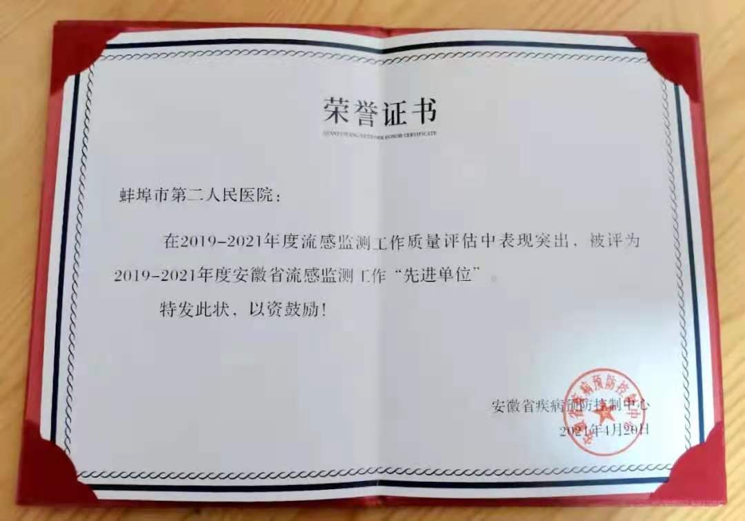 蚌埠市第二人民医院荣获“2019-2021年度流感监测先进单位”荣誉称号