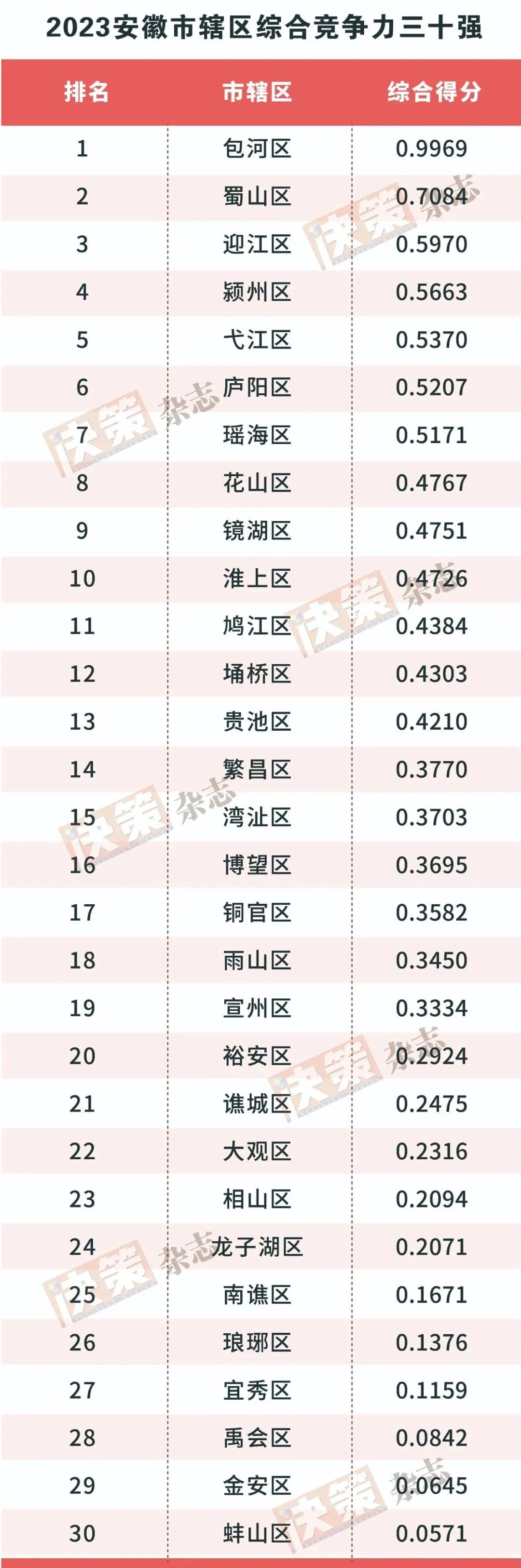 “安徽市辖区综合竞争力三十强”榜单由安徽财经大学安徽经济社会发展研究院、决策杂志社(安徽创新发展研究院)联合发布。