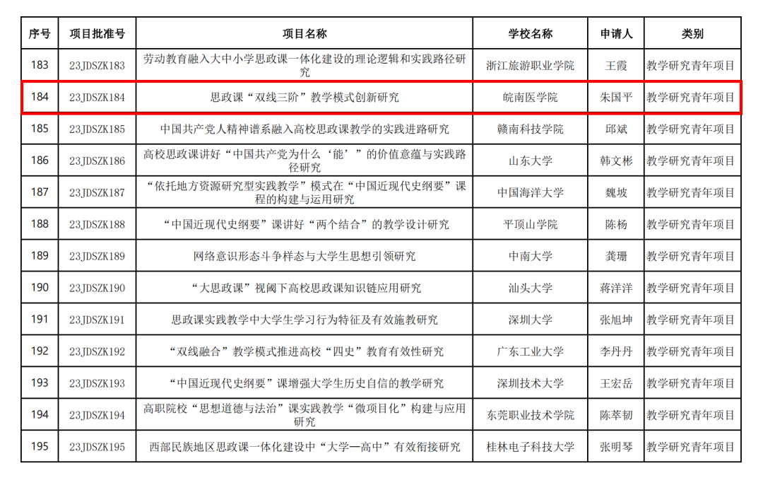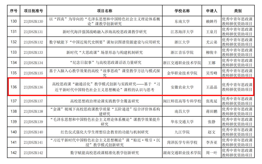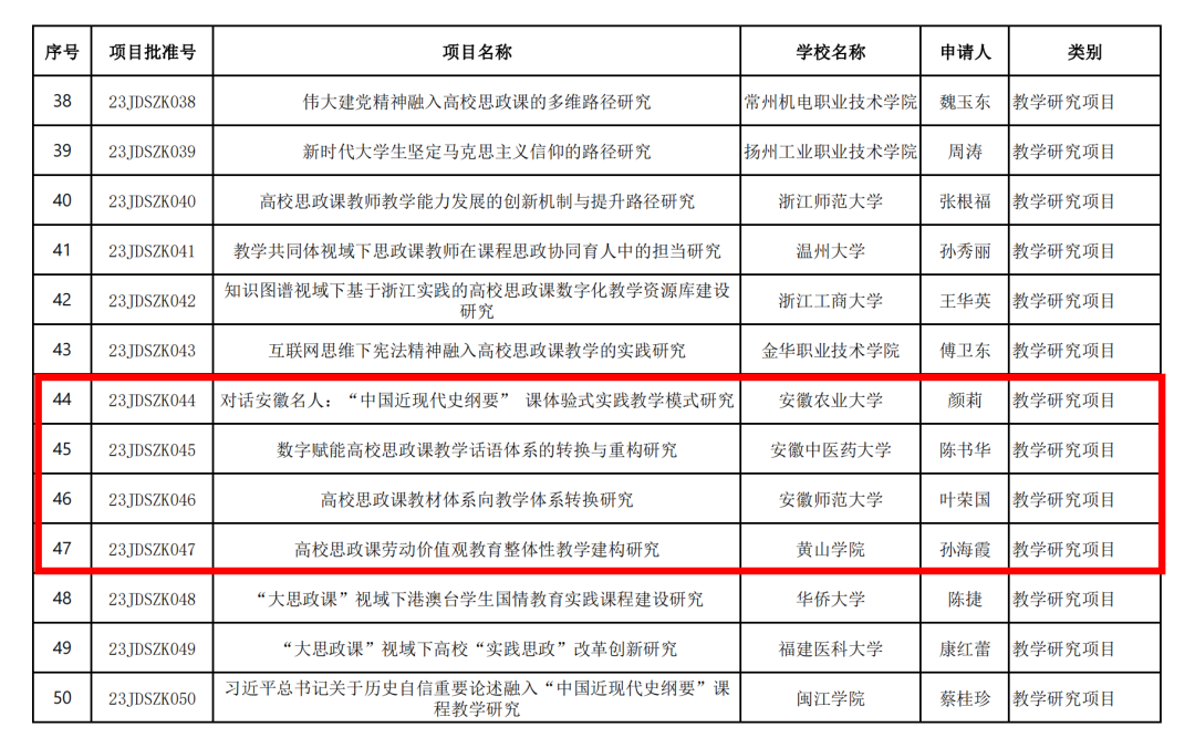 近日,教育部公布2023年度高校思想政治理论课教师研究专项一般项目立项结果,共有206项批准立项。其中包括5所安徽高校共6个项目,一起来看——