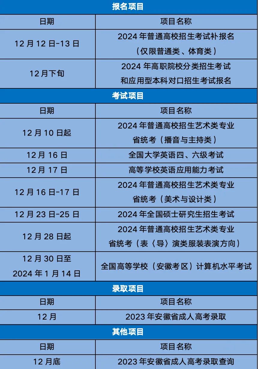 安徽省2023年12月教育招生考试月历
